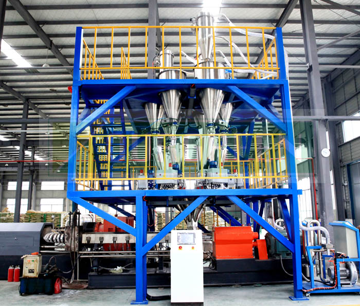 公司的自動(dòng)上料系統(tǒng)采用特制的攪拌上料系統(tǒng),以確保各種原料混合的均勻。自動(dòng)化控制保證系統(tǒng)運(yùn)行穩(wěn)定,按照生產(chǎn)配方將各組分別加入到料倉(cāng)中,經(jīng)真空上料機(jī)后充分?jǐn)嚢?,后將攪拌均勻的物料加入到擠出機(jī)的料斗中。該產(chǎn)品由公司優(yōu)化設(shè)計(jì),使其能夠適應(yīng)各種型號(hào)的擠出機(jī)組。
